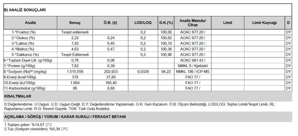 HeroMega markasından HeroWhey adıyla Whey Zero ürününe göz atıyoruz. Ambalajında ÜRT: 11/22 ve SKT: 11/24 bilgileri bulunuyor. Ancak dikkat çekici bir nokta, parti numarasının belirtilmemiş olması. Bu ürün, İstanbul’da üretiliyor ve TR-34-K-199252 işletme kayıt numarasıyla satışa sunuluyor. Bu karbonhidrat tozu, Aydınlar Mah. Sultangazi Cad. No:51/D Çekmeköy – İstanbul adresinde faaliyet gösteren EHM Grup Spor İnşaat İthalat İhracat Sanayi Ticaret Limited Şirketi tarafından üretiliyor. Aslında whey zero diyerek “bu üründe protein yok” demiş olabilir alt metinde, zira ürünün etiket beyanında, 30 gramlık tek bir porsiyonda 26 gram protein içerdiğini belirtiyor, yani 100 gramda 86,6 gram protein olduğunu söylüyor. Etiket böyle söylüyor. Ürünün üzerindeki etiket, ambalajında yazan bu. Ancak gerçekle yüzleştiğimizde, analiz raporu bu iddiayla çelişiyor ve 100 gramda sadece 7,62 gram protein bulunduğunu görüyoruz. Asıl dramatik tablo karbonhidrat oranında; %86 evet 100 gr ürünün içinde 86 gr karbonhidrat var, ayrıca %14,67 basit şekerler toplamı var.