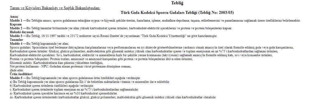 Türk Gıda Kodeksi Sporcu Gıdası Tebliğinde belirtilen ve sporcular için sınıflandırılmış sporcu gıdası içeriklerinin tanımı vardır.